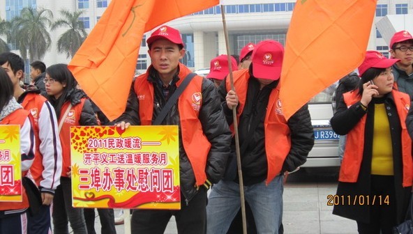 為全面開展創(chuàng)先爭優(yōu)活動,完善社會志愿服務(wù)體系,調(diào)動社會愛心力量,弘揚“奉獻(xiàn)、友愛、互助、進(jìn)步”的志愿精神。2011年1月14日,“2011民政暖流—開平義工送溫暖服務(wù)月”活動在城市北廣場隆重舉行。三埠街道團委聯(lián)合農(nóng)業(yè)銀行、百事通電腦、東河中學(xué)、新荻中學(xué)和義工服務(wù)隊等單位和團體參與了活動。