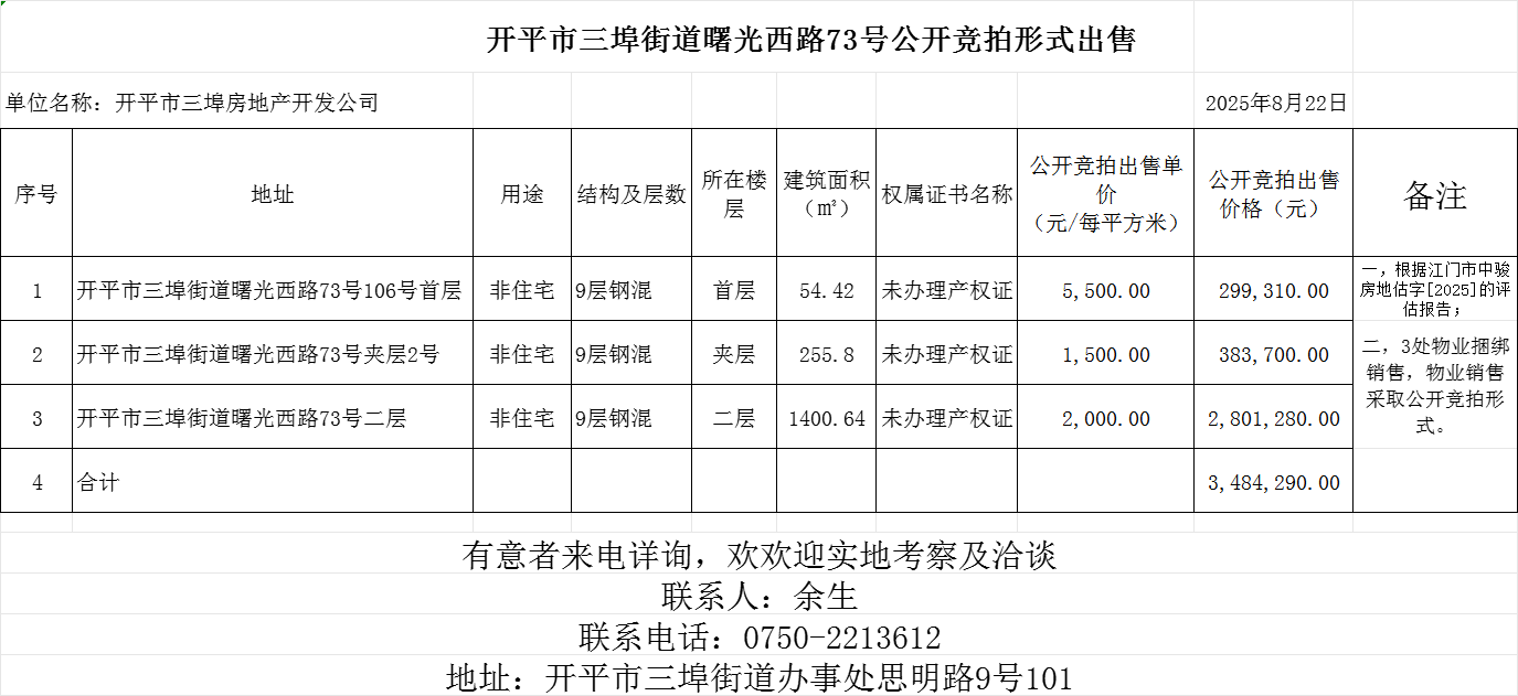 開平市三埠街道曙光西路73號公開競拍形式出售