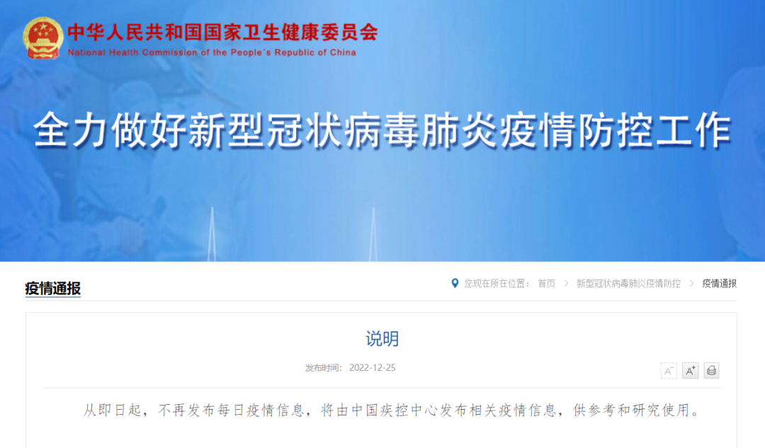 25日,國家衛(wèi)健委發(fā)布說明,從即日起,不再發(fā)布每日疫情信息,將由中國疾控中心發(fā)布相關(guān)疫情信息,供參考和研究使用。