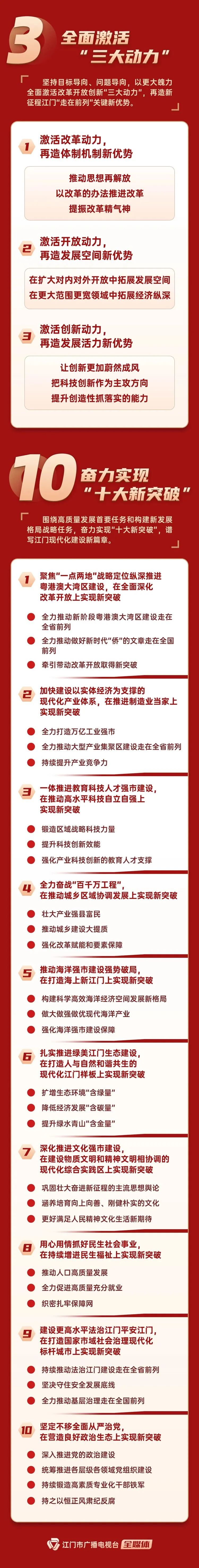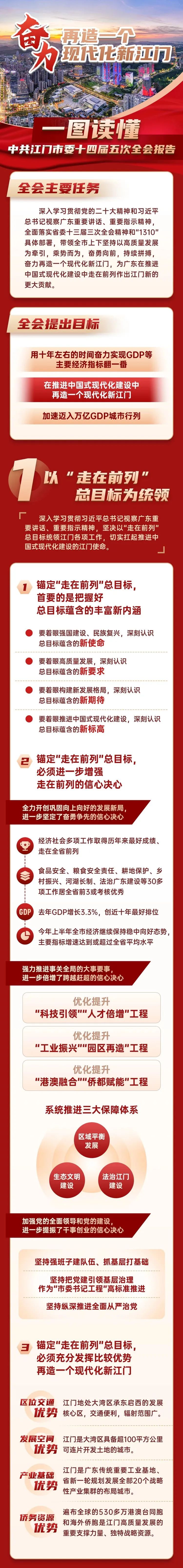 全會總結(jié)前一階段成果,把在學(xué)習(xí)貫徹中形成的思想共識、發(fā)展思路、工作舉措凝聚成為工作部署,進(jìn)一步動員引領(lǐng)全市上下堅(jiān)定不移沿著習(xí)近平總書記指引的方向,振奮精神再出發(fā)、爭先進(jìn)位再創(chuàng)業(yè),奮力再造一個現(xiàn)代化新江門,為廣東在推進(jìn)中國式現(xiàn)代化建設(shè)中走在前列作出江門新的更大貢獻(xiàn)。