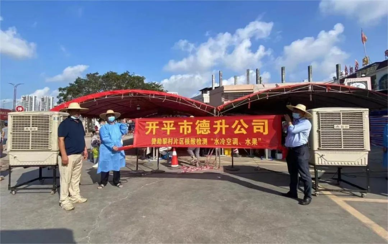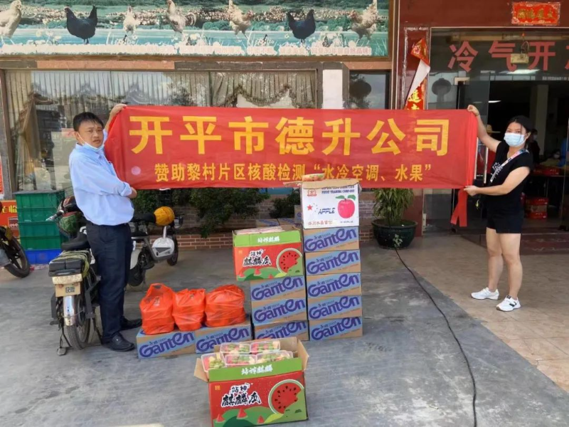 德升公司為黎村片區(qū)檢測點送來風扇、水冷空調(diào)和愛心水果