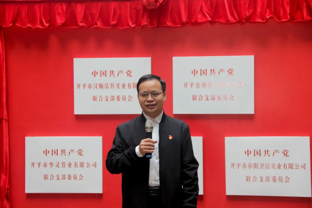 2月16日上午,水口鎮(zhèn)舉行開平金牌潔具有限公司聯(lián)合黨支部、開平市漢順潔具實(shí)業(yè)有限公司聯(lián)合黨支部、開平市中奧衛(wèi)浴有限公司聯(lián)合黨支部、開平市華靈管業(yè)有限公司聯(lián)合黨支部、開平市卓陽衛(wèi)浴實(shí)業(yè)有限公司聯(lián)合黨支部揭牌儀式。開平市政協(xié)黨組成員、副主席,水口鎮(zhèn)黨委書記劉劍鋒,開平市委組織部副部長、市委“兩新”工委書記李榮杰,開平市委組織部部務(wù)委員黃偉龍以及水口鎮(zhèn)相關(guān)領(lǐng)導(dǎo)、各有關(guān)黨支部書記、企業(yè)負(fù)責(zé)人等出席揭牌儀式。