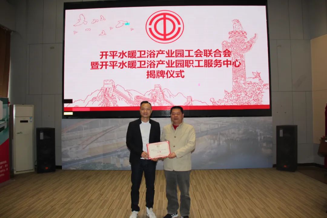 司徒錦泉為開平水暖衛(wèi)浴產(chǎn)業(yè)園工會聯(lián)合會第一屆委員會委員頒發(fā)當(dāng)選證書