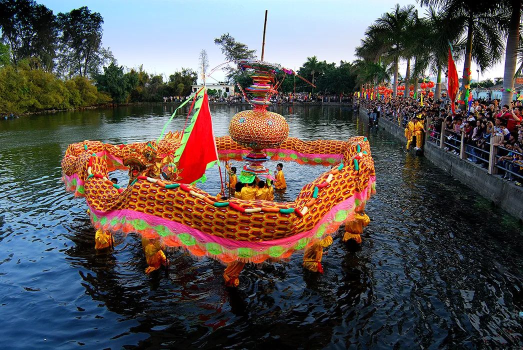正月十三的早晨,按預(yù)先定出的舞燈頭的三個村,抬著豬、牛等祭品,在泮村祖祠參拜祖先,然后起燈。三個燈的起燈地點不同,其中1號燈在泮村,2號燈在塘唇或龍?zhí)锘驎鴱B,其中3號燈在大塘村,起燈時,花燈被高高舉起,并在祠堂外面游走三圈,這就是起燈。而這個被群獅圍繞著的大型花燈,就是今年被選出最美最好的燈,成為一號燈,成為領(lǐng)頭巡游的燈。