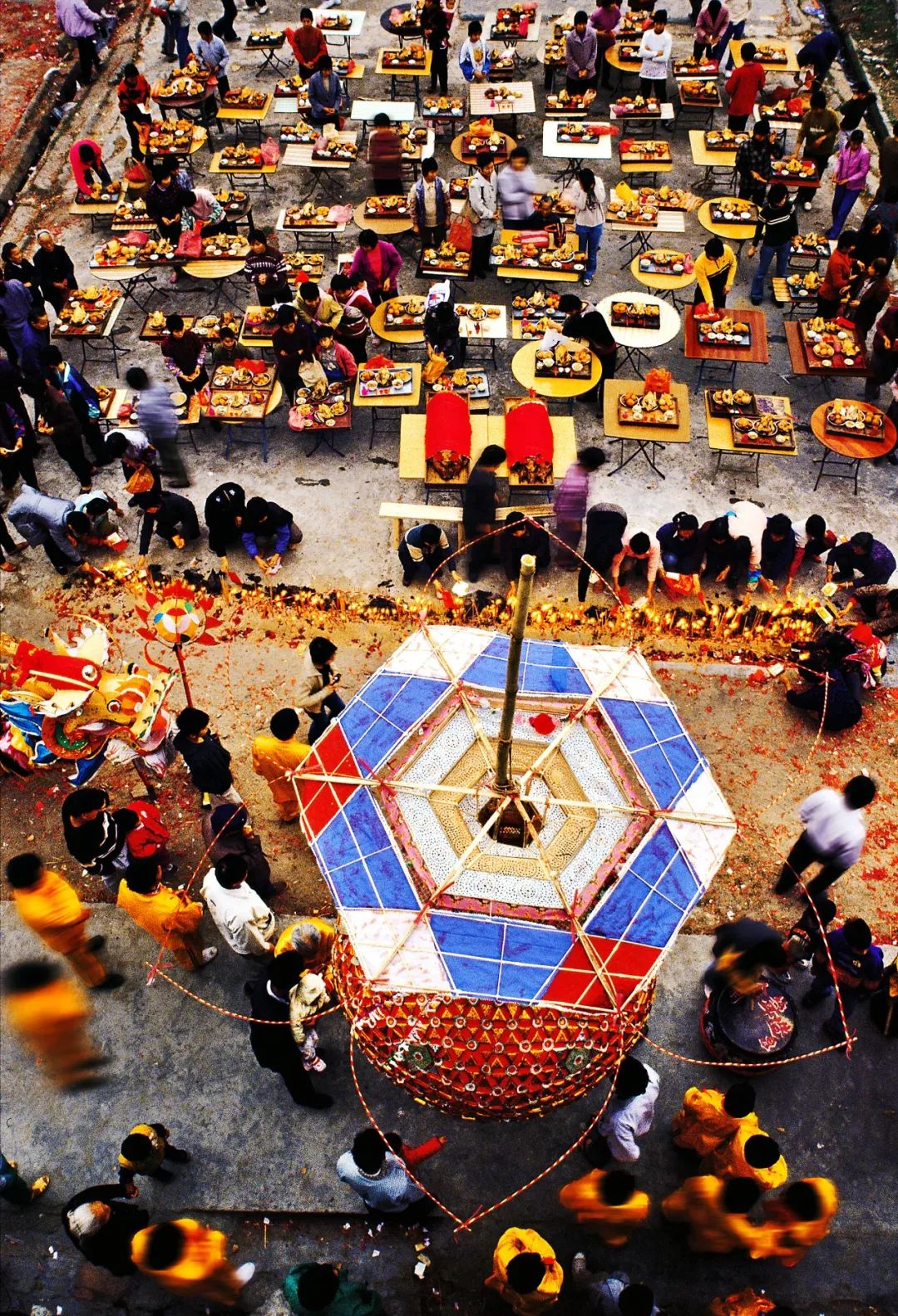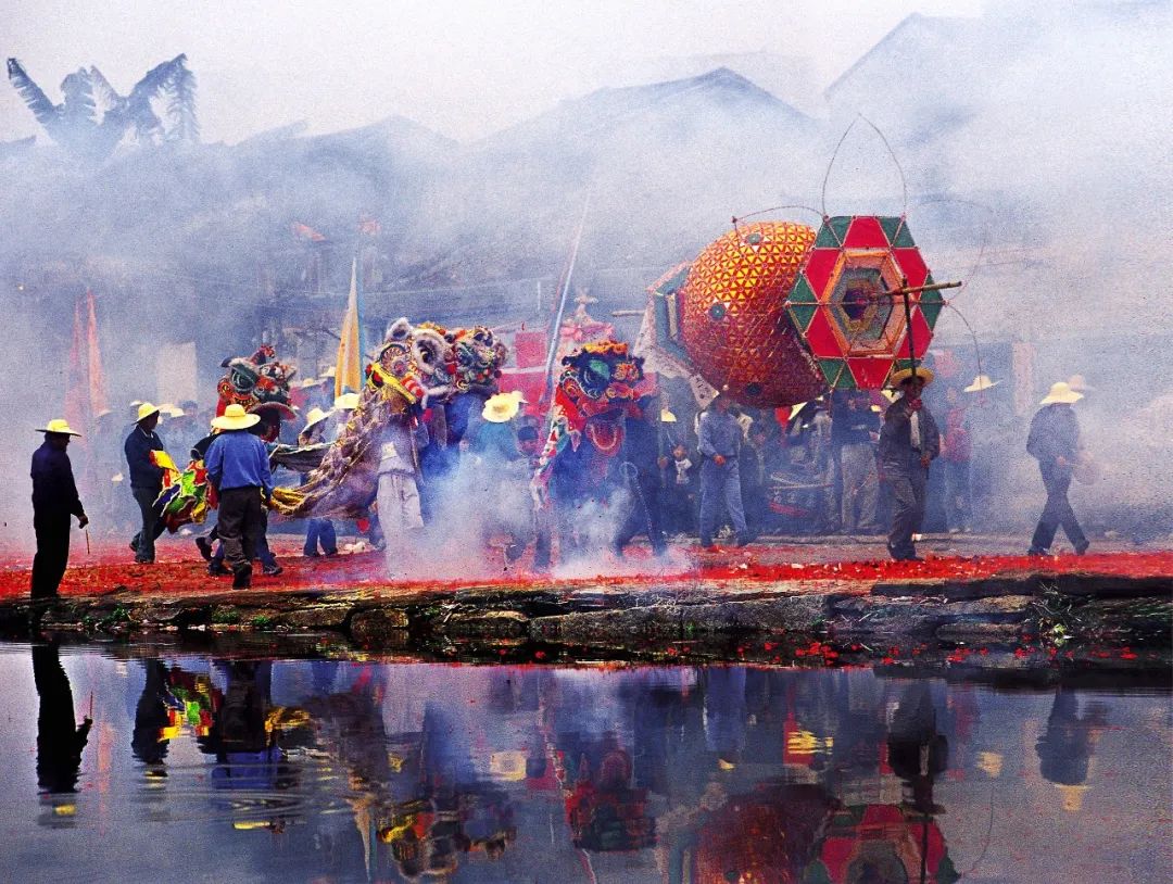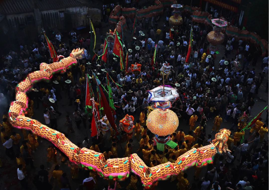 正月十二這天,代表泮村三間廟中的頭王、二王、三王的三個大花燈,由統(tǒng)一著裝的送燈隊伍送到書廈村集中,再以三聲地炮為號,醒獅相伴護(hù)送至泮村的廳泉祖祠,舉行三牲醴酒祭祖儀式。