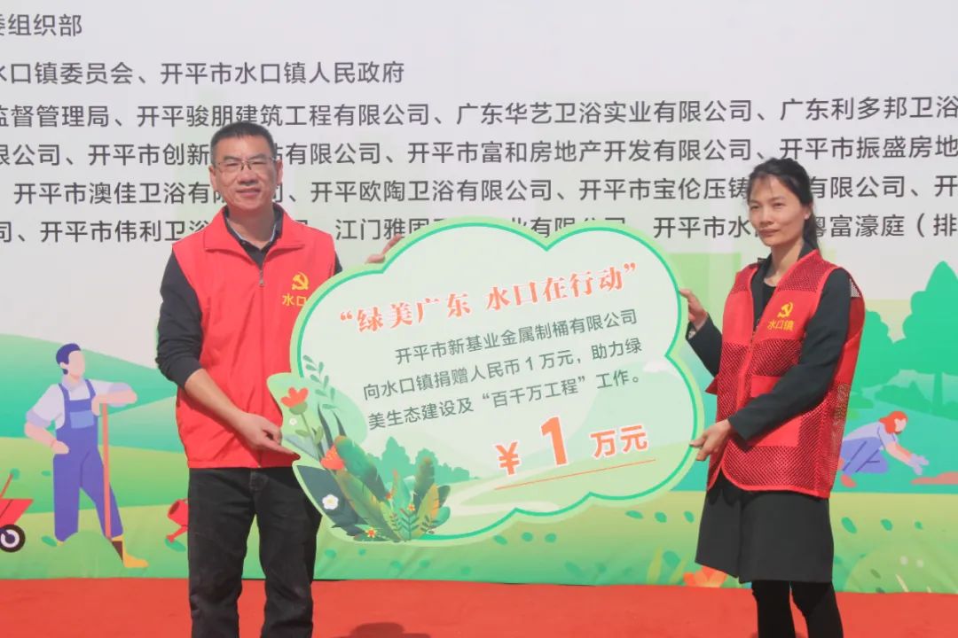 儀式上,結對幫扶單位江門市市場監(jiān)督管理局和16家愛心企業(yè)向水口鎮(zhèn)人民政府捐贈人民幣共計75.097萬元,定向用于水口鎮(zhèn)鄉(xiāng)村綠化項目。