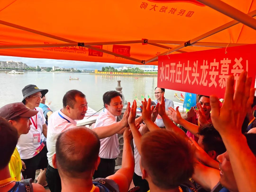 賽前,水口鎮(zhèn)黨委書記司徒錦泉,鎮(zhèn)黨委副書記、鎮(zhèn)長胡萬程到檢錄區(qū)為轄區(qū)龍舟隊(duì)隊(duì)員提振信心、鼓勁加油。