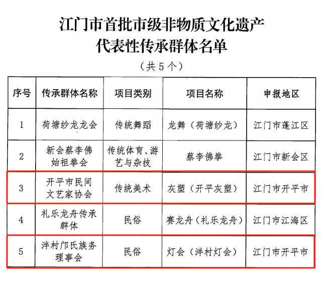 本次認定江門市首批市級非物質文化遺產代表性傳承群體共5個,其中開平市推薦的燈會(泮村燈會)代表性傳承群體泮村鄺氏族務理事會、灰塑(開平灰塑)代表性傳承群體開平市民間文藝家協(xié)會,被確定為首批江門市級非物質文化遺產代表性傳承群體。
