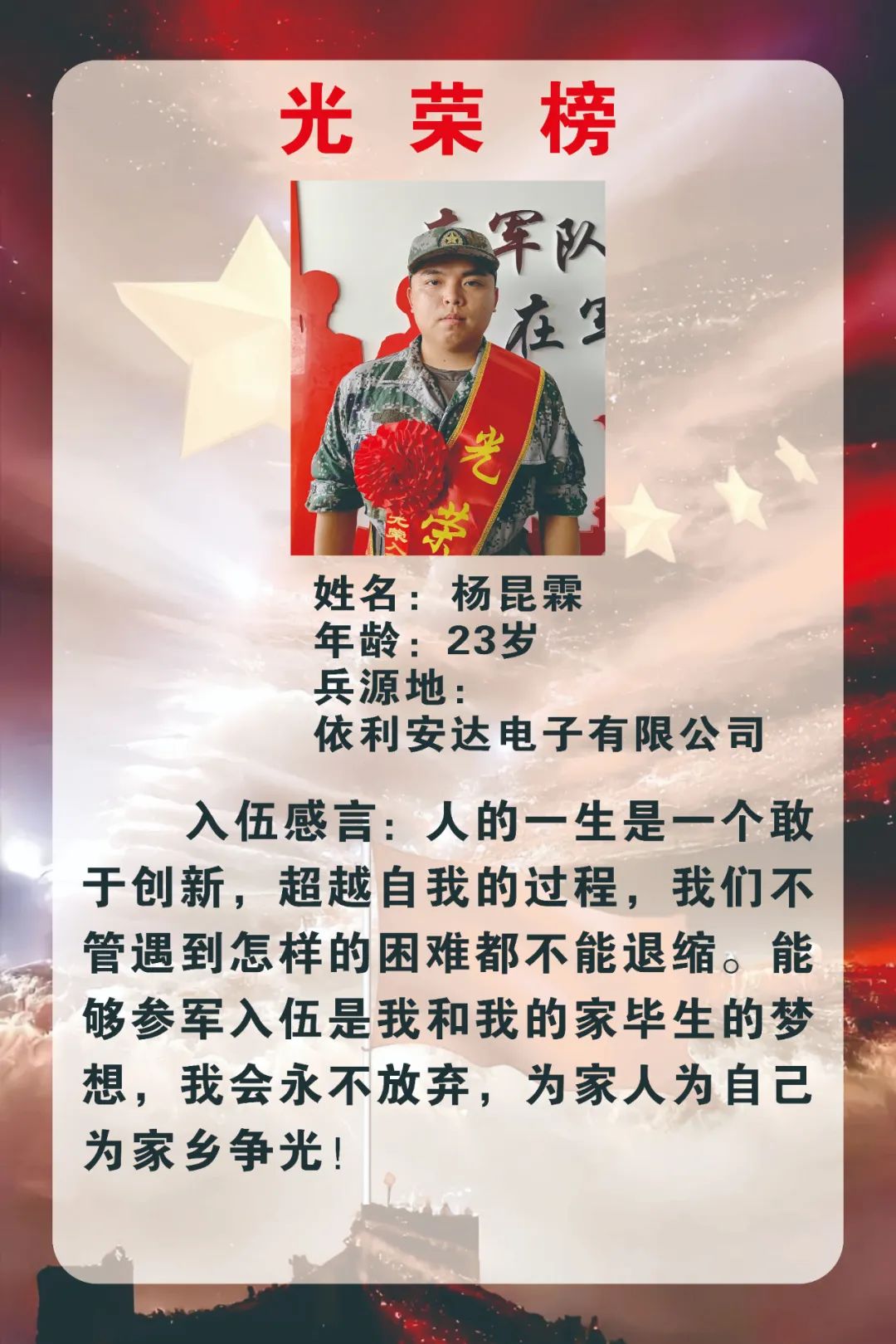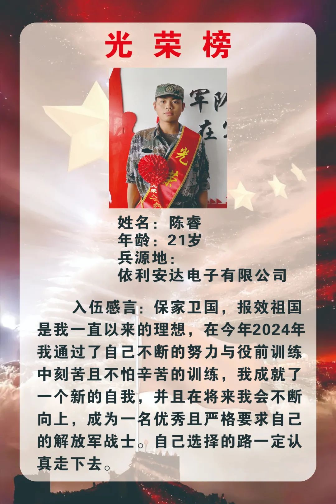 在此輪征兵工作中,開平依利安達電子有限公司廣泛動員滿足條件的青年員工踴躍報名參軍。經(jīng)過層層篩選,最終2名大學(xué)生員工懷揣滿腔熱血與豪情奔赴軍營,踏上保家衛(wèi)國新征程。