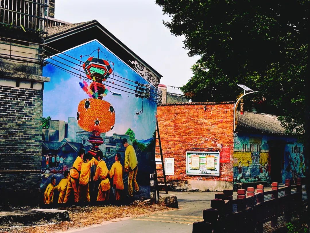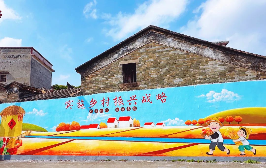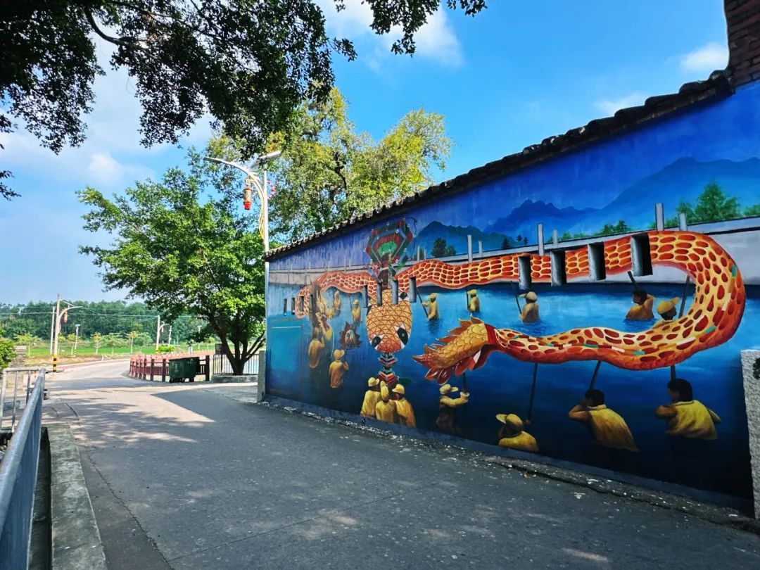 在畫(huà)筆起落、線條勾勒、顏料涂抹間,惠農(nóng)政策、燈會(huì)活動(dòng)、喜慶醒獅、金黃稻田、古樸農(nóng)舍、美麗庭院以及紅線女粵劇文化等泮村特色文化元素躍然白墻黛瓦,既展現(xiàn)了黨建引領(lǐng)作用的生動(dòng)場(chǎng)景,又彰顯泮村村在推進(jìn)“百千萬(wàn)工程”和鄉(xiāng)村振興上的豐碩成果。