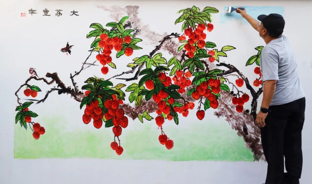 在“大荔豐年”圖中,只見(jiàn)串串鮮紅飽滿(mǎn)的荔枝掛滿(mǎn)枝頭,水靈晶瑩,色香誘人,形象生動(dòng)。