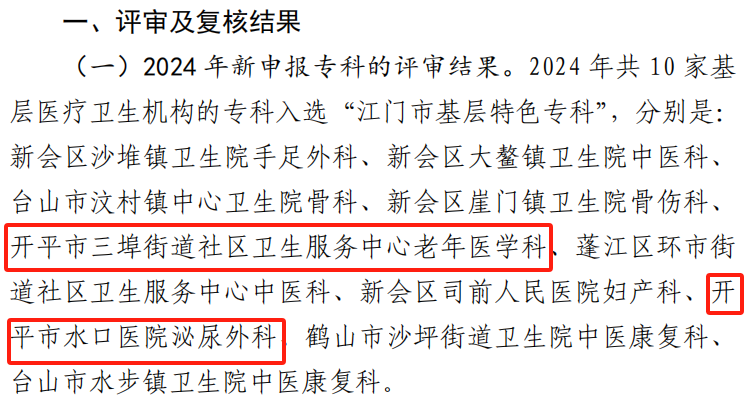 近日,根據(jù)《江門市衛(wèi)生健康局關(guān)于印發(fā)〈江門市基層特色??平ㄔO(shè)與評審工作方案〉的通知》(江衛(wèi)函〔2024〕212 號)精神,我市基層醫(yī)療衛(wèi)生機(jī)構(gòu)的學(xué)科體系建設(shè)取得了重要成果。一是在2024年度江門市基層特色??圃u審中,我市開平市水口醫(yī)院泌尿外科和開平市三埠街道社區(qū)衛(wèi)生服務(wù)中心老年醫(yī)學(xué)科脫穎而出,成功入選“江門市基層特色??啤薄6?020年已獲評??频膹?fù)核結(jié)果繼續(xù)保留開平市蒼城鎮(zhèn)中心衛(wèi)生院頸肩腰腿痛???“江門市基層特色??啤狈Q號。這就標(biāo)志著我市基層醫(yī)療衛(wèi)生服務(wù)能力和學(xué)科發(fā)展水平逐年提升。