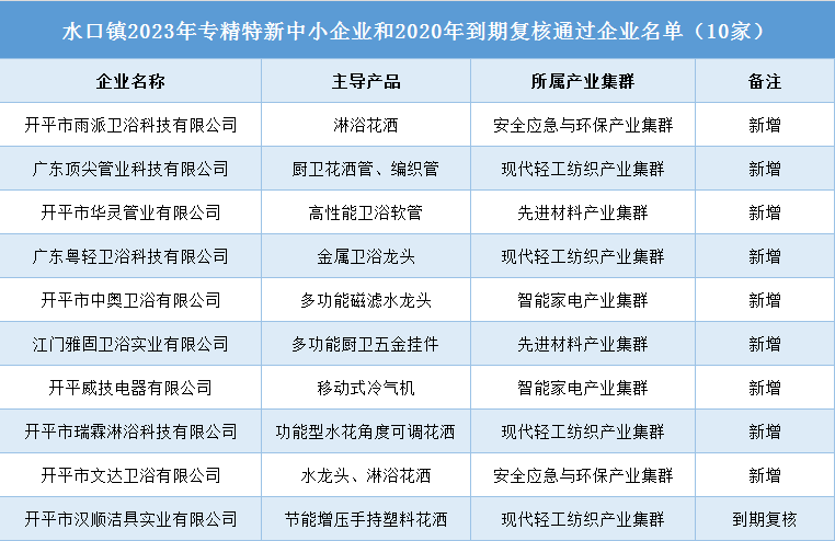 1月8日,廣東省工業(yè)和信息化廳公布2023年專精特新中小企業(yè)和2020年到期復(fù)核通過企業(yè)名單,水口鎮(zhèn)申請專精特新中小企業(yè)認(rèn)定(含到期復(fù)核1家)企業(yè)共10家,全部通過認(rèn)定審核。截至目前,水口鎮(zhèn)擁有省級專精特新中小企業(yè)企業(yè)24家(水暖衛(wèi)浴19家),數(shù)量居全市第一。
