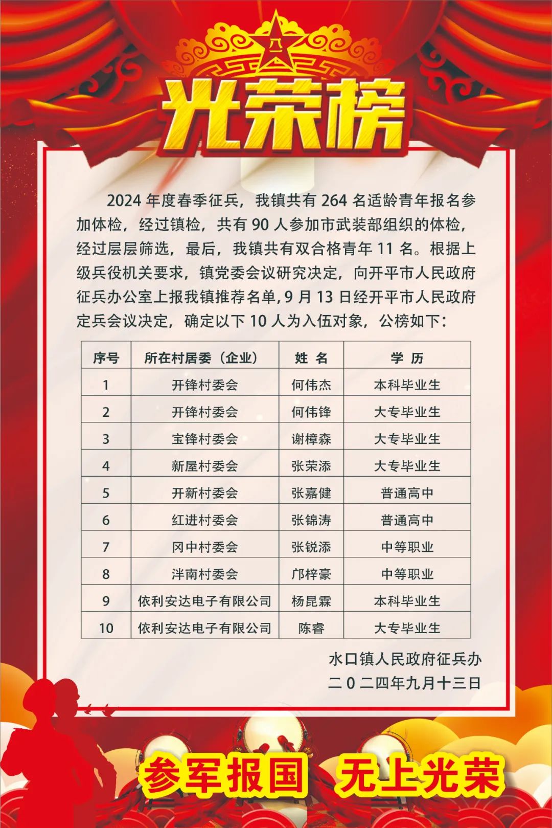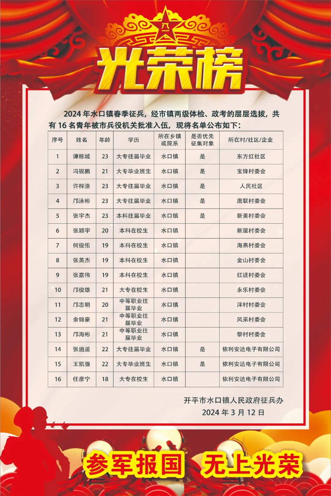 2024年春季征兵,水口鎮(zhèn)共有146名適齡青年報(bào)名應(yīng)征青年積極響應(yīng)國家號召,參加征兵體檢,接受嚴(yán)格挑選。經(jīng)過體檢、政考、定兵等環(huán)節(jié),水口鎮(zhèn)共有16名優(yōu)秀青年光榮入伍。
