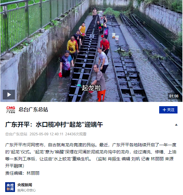 每年端午前夕的“起龍”儀式,是開平龍舟文化的重要環(huán)節(jié),包含祈福、起船、清洗、裝飾及試劃等多個(gè)步驟。傍晚6時(shí)許,隨著鞭炮聲響起,數(shù)十名村民躍入及腰深的河水中,舀水清淤、擦洗船身,約半小時(shí)后,一條長(zhǎng)約39米的坤甸木龍舟逐漸顯露真容。