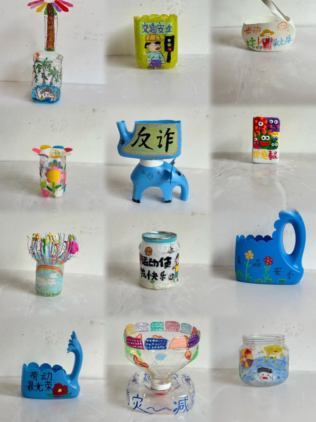 活動準備期間,致和小學各班級依托綜合實踐課,鼓勵同學們充分發(fā)揮想象力和創(chuàng)造力,利用塑料瓶、易拉罐等廢棄物品制作創(chuàng)意花瓶。孩子們積極響應,用一雙雙巧手將廢舊物品變“廢”為寶,制作出一件件精美的手工作品,每一件作品都蘊含著他們對環(huán)保的獨特理解和深刻感悟,每一處細節(jié)都藏著對綠色生態(tài)的熱愛。