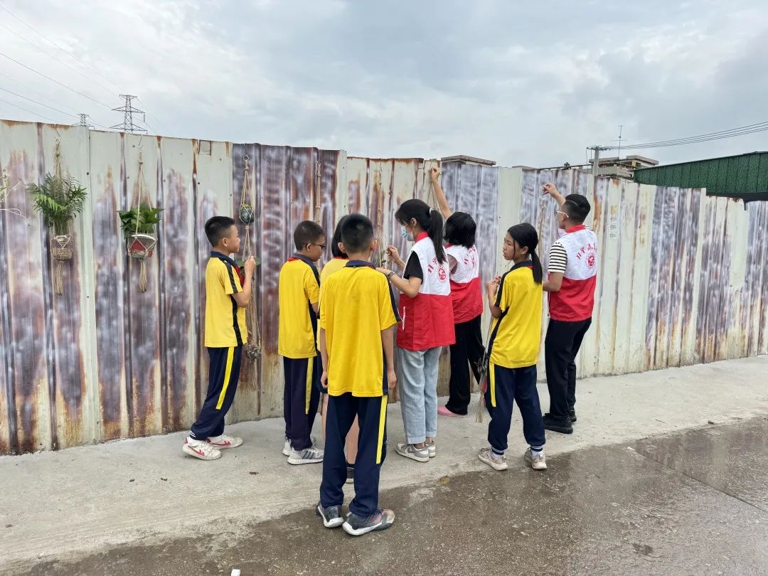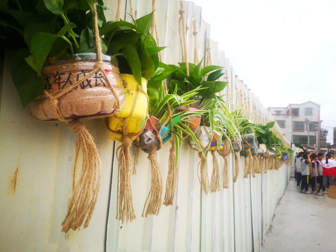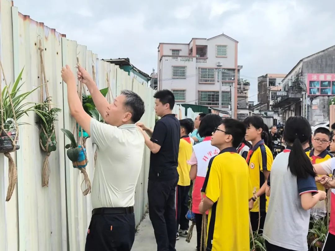 活動當日,在莊嚴的《綠美行動倡議書》宣讀聲中,共建行動正式啟動。師生分組協(xié)作,將創(chuàng)意花瓶通過掛鉤、麻繩等工具有序懸掛至學學校大門前廠房鐵皮外墻及周邊指定公共區(qū)域。