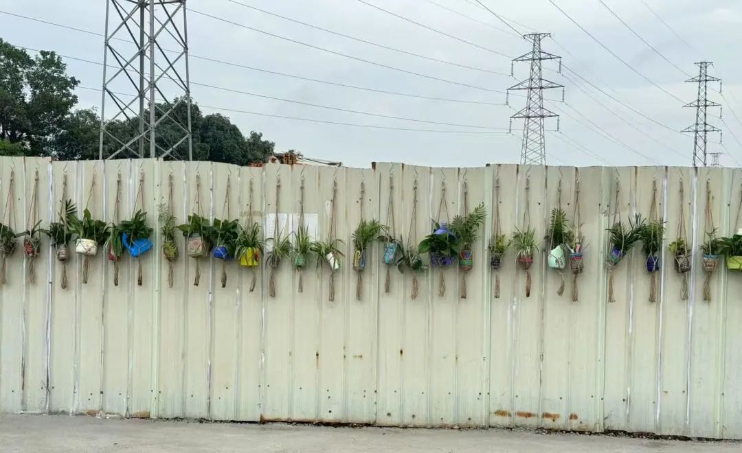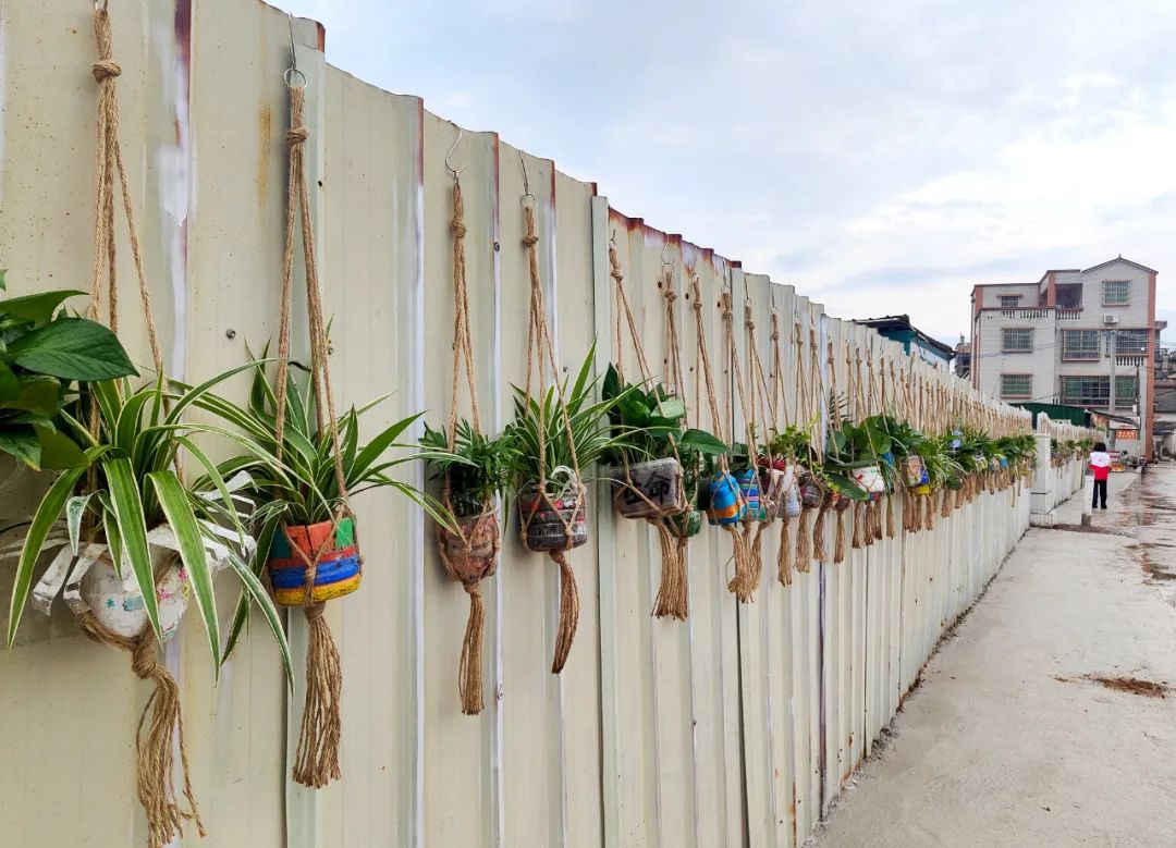 一個個承載著奇思妙想的花瓶里,綠植蓬勃生長,與鄉(xiāng)村風貌相映成趣,原本單調(diào)的鐵皮墻搖身變?yōu)?“會呼吸的藝術(shù)長廊”。