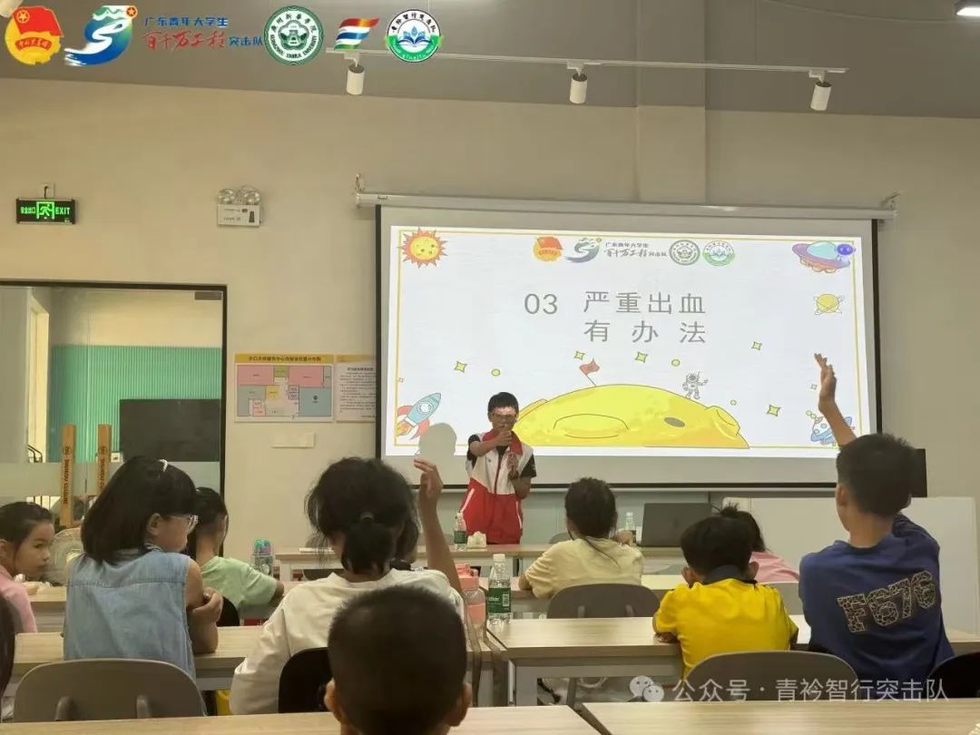 在常見(jiàn)傷口處理和中暑應(yīng)對(duì)課堂上,隊(duì)員們?yōu)樵趫?chǎng)學(xué)員講解了實(shí)用的處理方法。在傷口處理方面,授課隊(duì)員強(qiáng)調(diào)先清潔雙手,用生理鹽水沖洗、剔除異物,淺傷口涂碘伏消毒,深傷口或出血多者需按壓止血并及時(shí)就醫(yī),中暑處理則提到要迅速轉(zhuǎn)移患者至陰涼處,解開(kāi)衣物、物理降溫,補(bǔ)充含鹽飲品,重癥情況需立即送醫(yī),還提醒孩子們?cè)诟邷靥熳⒁夥罆裱a(bǔ)水,不要在炎熱的天氣進(jìn)行長(zhǎng)時(shí)間的戶外活動(dòng)。