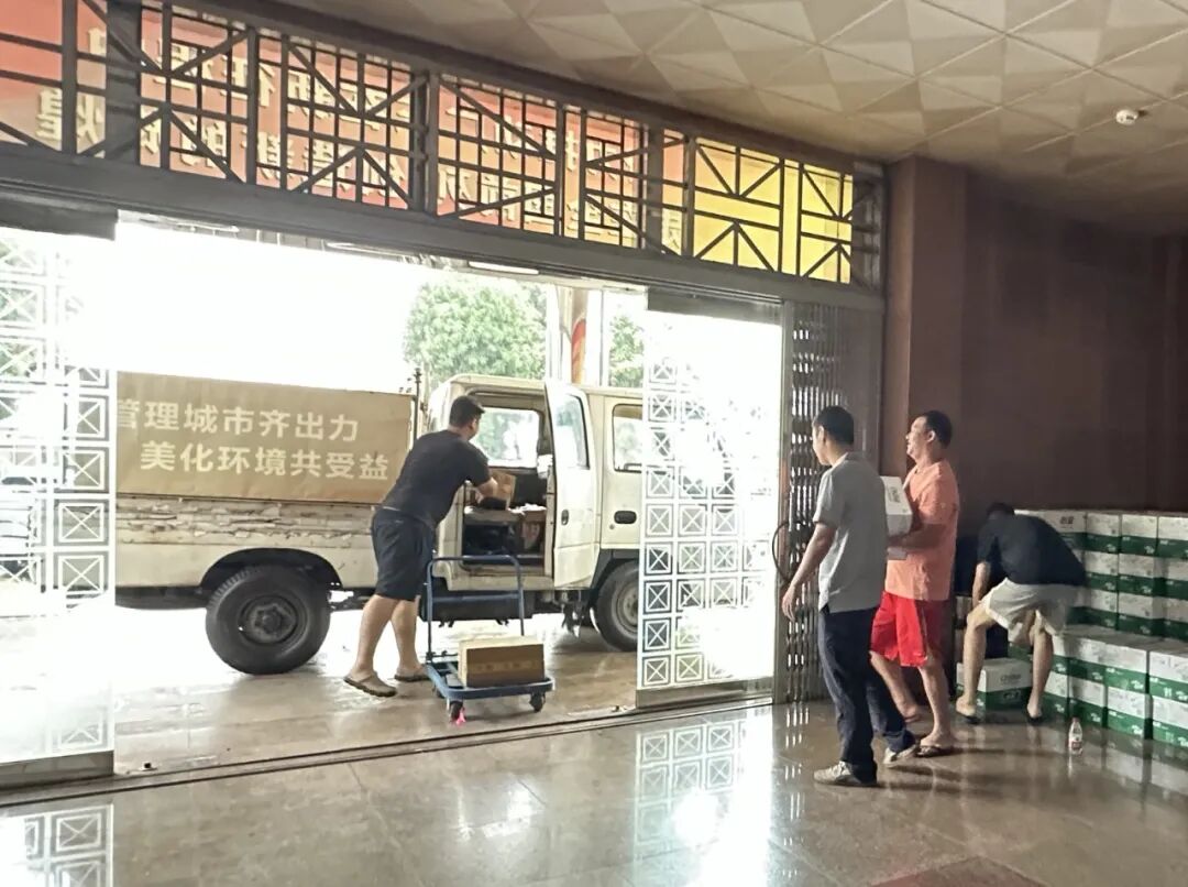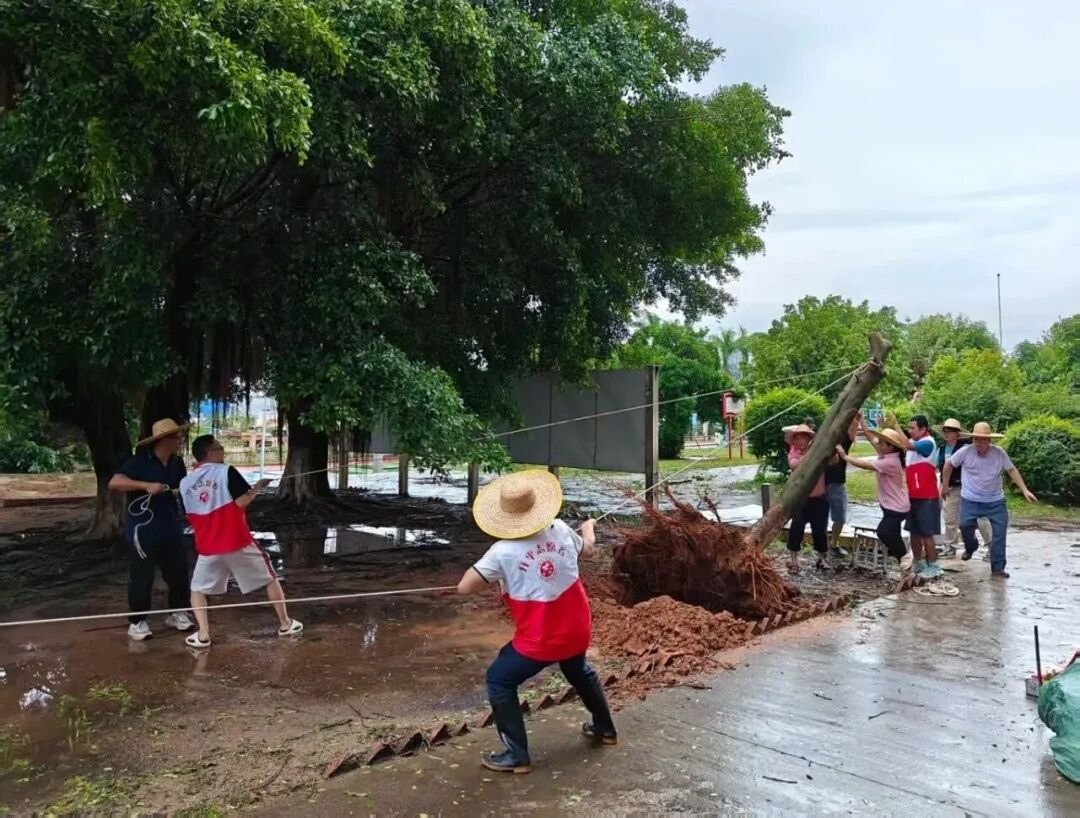 水口鎮(zhèn)綜合行政執(zhí)法隊沖鋒在前,清理倒地樹木,搬運破損設施,迅速打通道路。