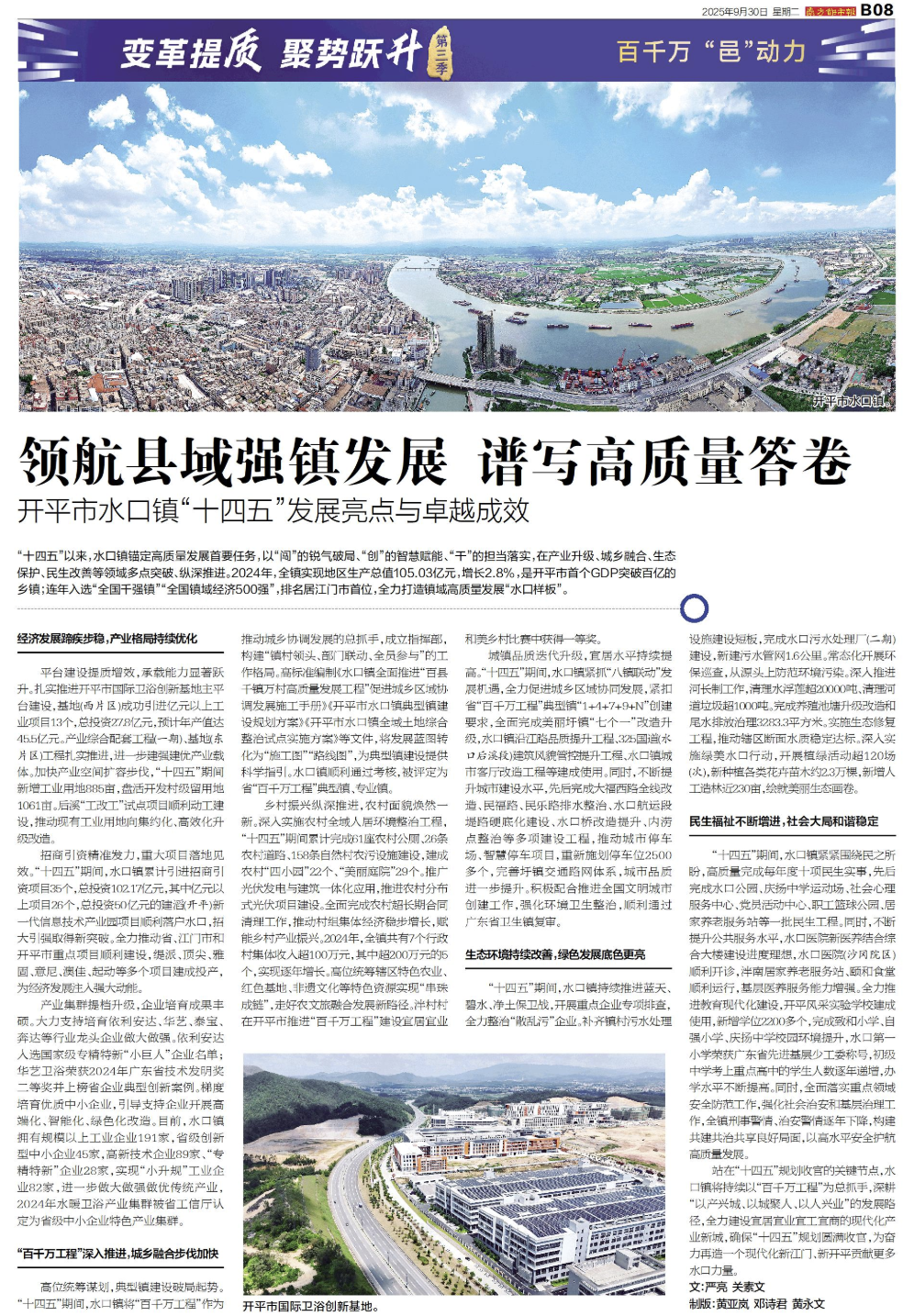近日,南方都市報整版刊發(fā)《開平市水口鎮(zhèn):領(lǐng)航縣域強鎮(zhèn)發(fā)展 譜寫高質(zhì)量答卷》,從“百千萬工程”、經(jīng)濟發(fā)展、生態(tài)環(huán)境、民生福祉等多維度,全面展示了水口鎮(zhèn)在“十四五”期間經(jīng)濟社會各項事業(yè)發(fā)展取得的豐碩成果,為加速推動水口打造成為宜居宜業(yè)宜工宜商的現(xiàn)代化產(chǎn)業(yè)新城、實現(xiàn)“十五五”良好開局匯聚磅礴力量?,F(xiàn)將全文轉(zhuǎn)載如下: