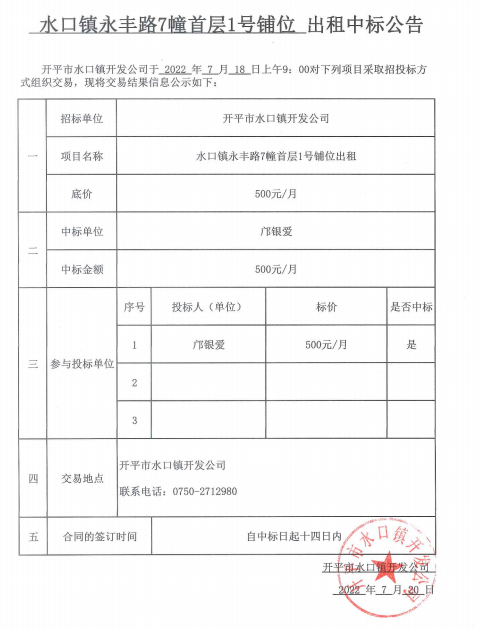 水口鎮(zhèn)永豐路7幢首層1號(hào)鋪位出租中標(biāo)公告