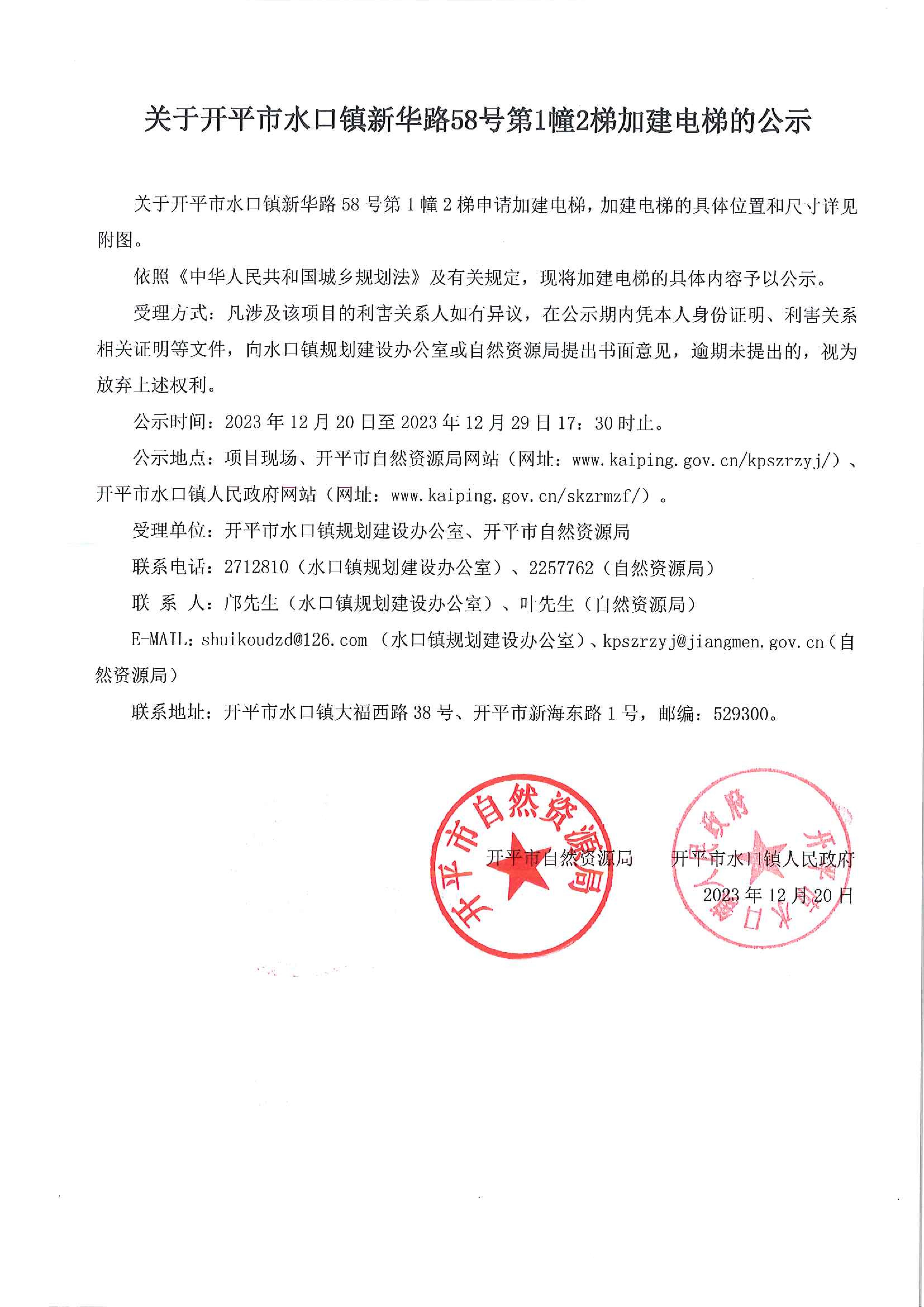 關(guān)于開平市水口鎮(zhèn)新華路58號第1幢2梯申請加建電梯,加建電梯的具體位置和尺寸詳見附圖。