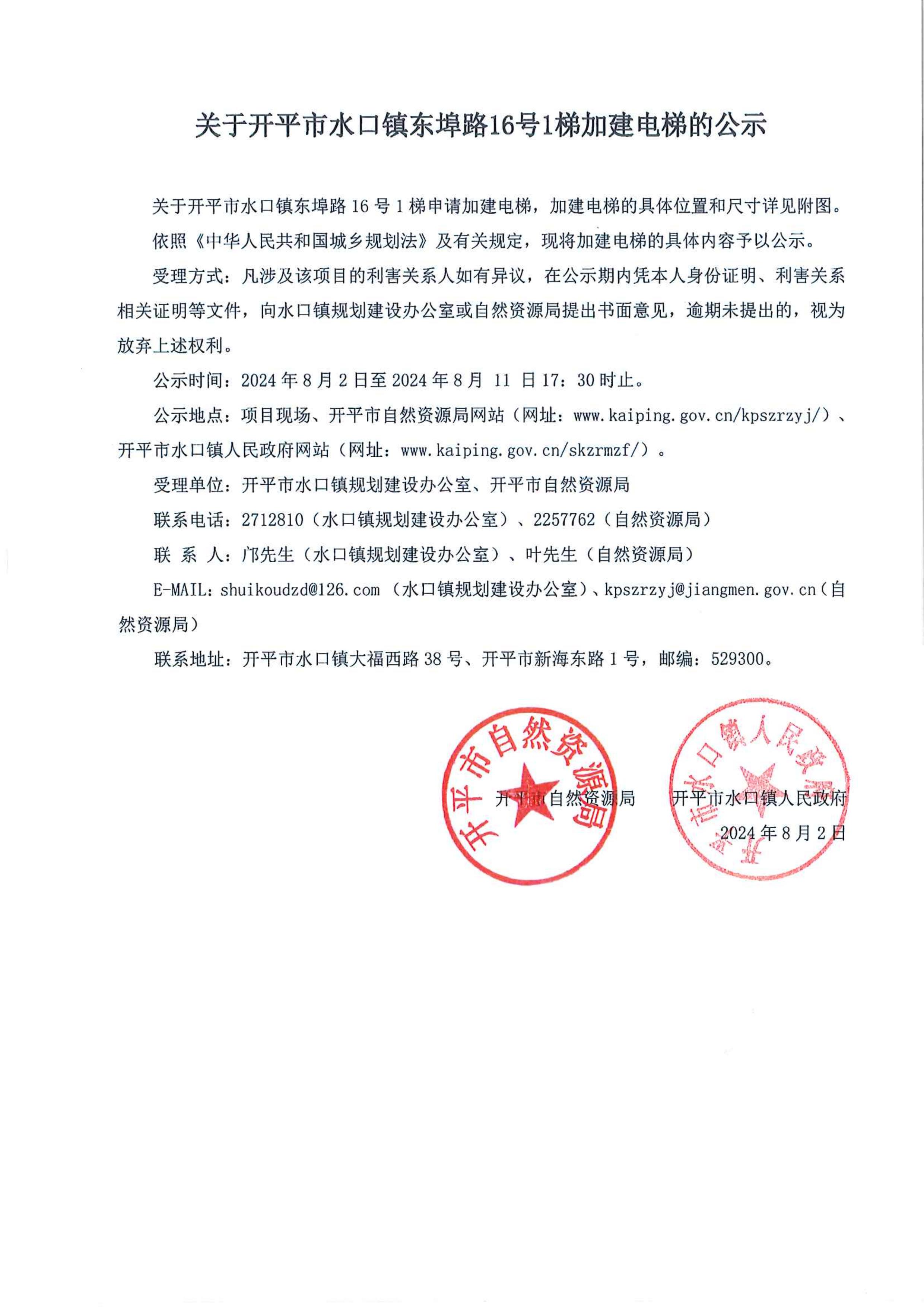 關(guān)于開平市水口鎮(zhèn)東埠路16號1梯申請加建電梯,加建電梯的具體位置和尺寸詳見附圖。依照《中華人民共和國城鄉(xiāng)規(guī)劃法》及有關(guān)規(guī)定,現(xiàn)將加建電梯的具體內(nèi)容予以公示。