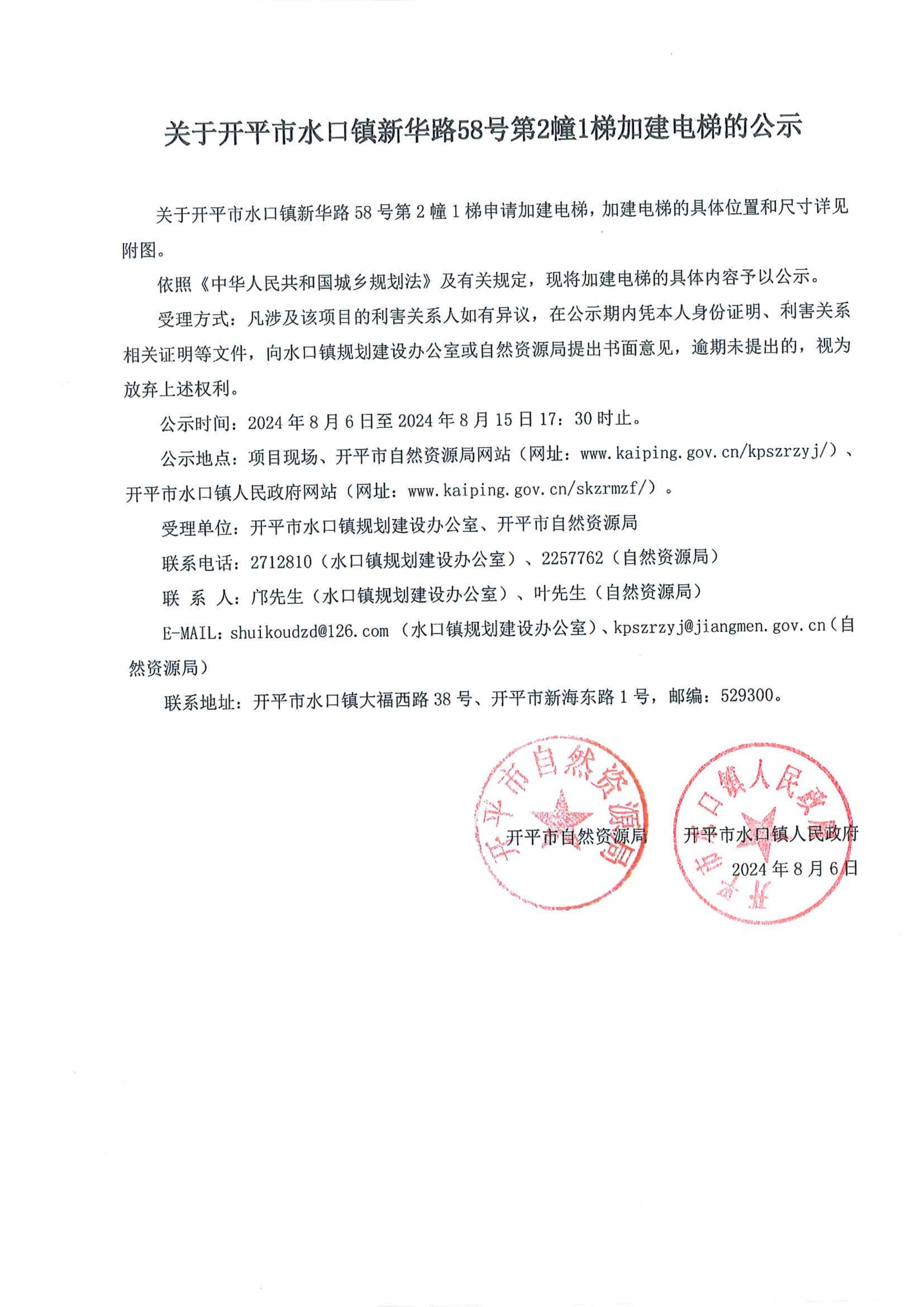 依照《中華人民共和國城鄉(xiāng)規(guī)劃法》及有關(guān)規(guī)定,現(xiàn)將加建電梯的具體內(nèi)容予以公示。受理方式:凡涉及該項目的利害關(guān)系人如有異議,在公示期內(nèi)憑本人身份證明、利害關(guān)系相關(guān)證明等文件,向水口鎮(zhèn)規(guī)劃建設(shè)辦公室或自然資源局提出書面意見,逾期未提出的,視為放棄上述權(quán)利。