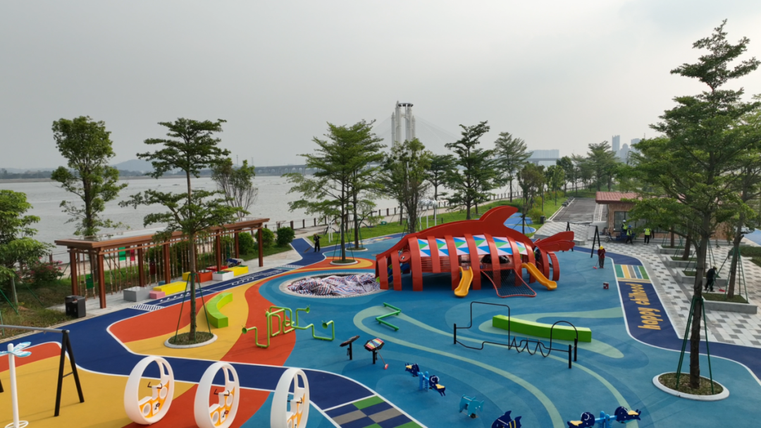 潭江生態(tài)濕地長廊項目位于開平市水口新美片區(qū)潭江大道南側(cè),東起東九路,西至西三路,南至現(xiàn)狀碧道,呈帶狀分布,面積約4公頃。項目主要建設(shè)內(nèi)容為海綿城市建設(shè)元素、停車場、健身跑道、休閑運動場、綠化工程、照明工程等,其中兒童樂園面積約1630平方米,設(shè)置有大魚滑梯、兒童健身器材、蹦床、攀爬網(wǎng)、攀巖點等安全、有趣的兒童設(shè)施。