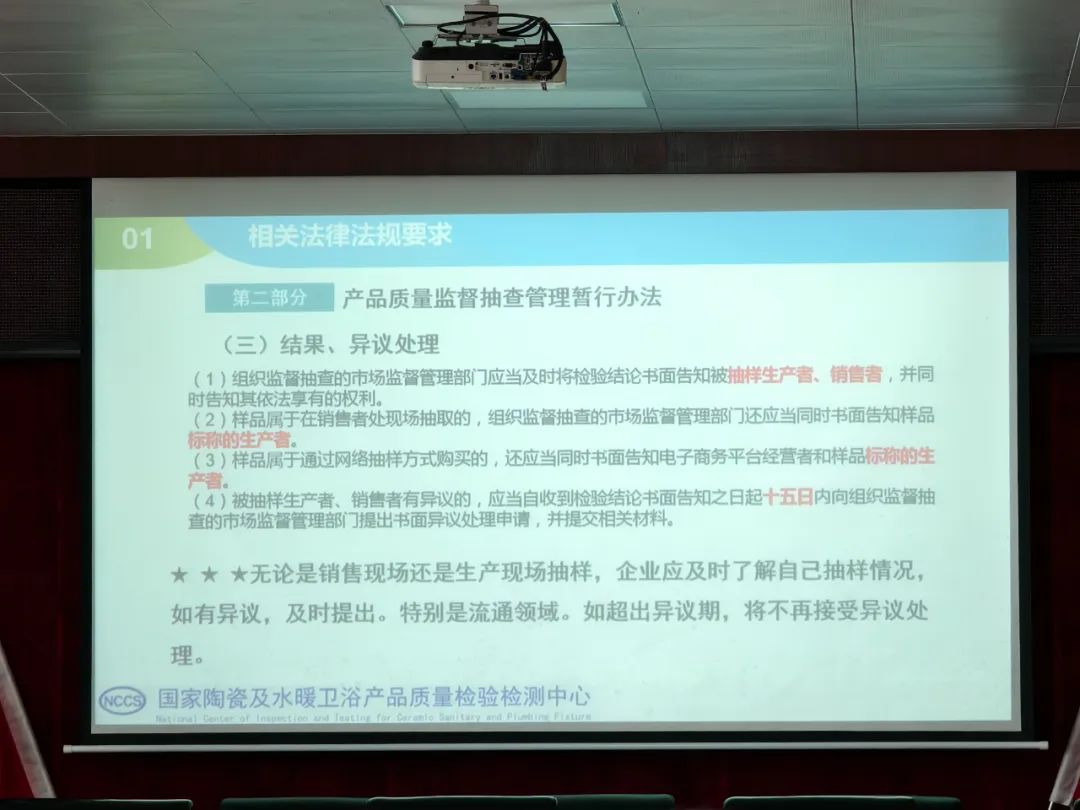 會議特別邀請了國家陶瓷及水暖衛(wèi)浴產(chǎn)品質量檢驗檢測中心高級工程師楊志雄作為主講嘉賓,針對國家及省抽檢中常見的不合格項目及注意事項作了深入淺出、通俗易懂的培訓,得到與會企業(yè)代表的一致好評。
