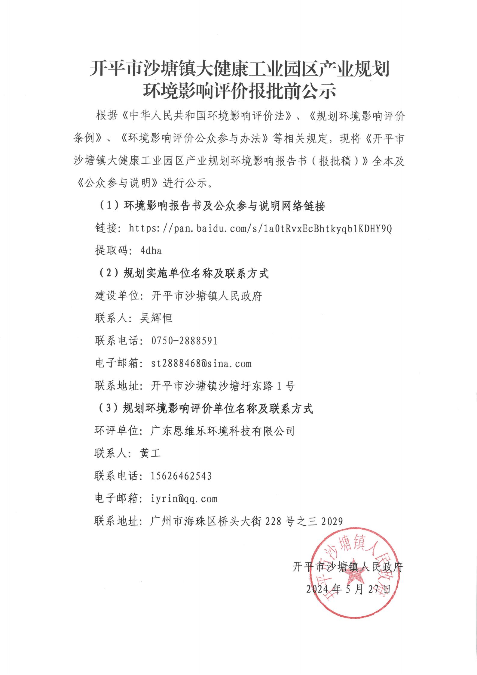 根據(jù)《中華人民共和國環(huán)境影響評價法》、《規(guī)劃環(huán)境影響評價條例》、《環(huán)境影響評價公眾參與辦法》等相關(guān)規(guī)定,現(xiàn)將《開平市沙塘鎮(zhèn)大健康工業(yè)園區(qū)產(chǎn)業(yè)規(guī)劃環(huán)境影響報告書(報批稿)》全本及《公眾參與說明》進行公示。