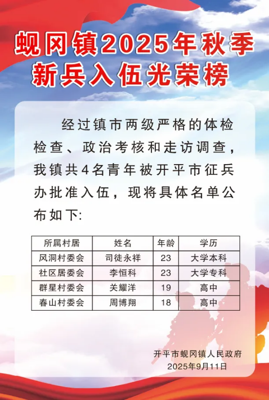 秋高氣爽,丹桂飄香。在這滿(mǎn)載收獲與希望的季節(jié),蜆岡鎮(zhèn)2025年秋季征兵工作歷經(jīng)數(shù)月嚴(yán)謹(jǐn)細(xì)致、層層把關(guān)的選拔流程,已圓滿(mǎn)落下帷幕。經(jīng)過(guò)鎮(zhèn)初檢、市復(fù)檢的嚴(yán)格體格檢查,深入全面的政治考核,以及為期半月的役前教育訓(xùn)練淬煉,最終,蜆岡鎮(zhèn)四位優(yōu)秀青年脫穎而出,被正式確定為光榮的入伍對(duì)象,即將奔赴火熱軍營(yíng),開(kāi)啟保家衛(wèi)國(guó)的嶄新人生篇章。9月15日,蜆岡鎮(zhèn)為四名新兵舉辦了一場(chǎng)簡(jiǎn)樸而隆重、溫馨而熱烈的新兵歡送會(huì)。會(huì)場(chǎng)內(nèi)氣氛莊重而熱烈,鎮(zhèn)黨政主要領(lǐng)導(dǎo)、武裝部負(fù)責(zé)同志及相關(guān)村(社區(qū))干部齊聚一堂,共同為即將踏上征程的四名優(yōu)秀青年壯行。